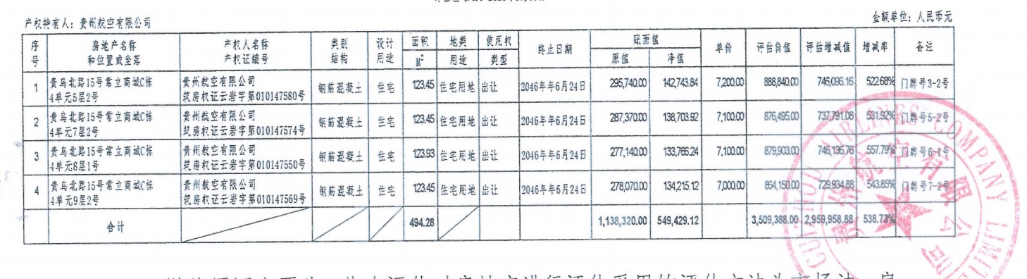 | 資產(chǎn)公告信息 | 資產(chǎn)描述 | 本次標的為貴州航空有限公司持有的貴州省貴陽市貴烏北路15號常立商城四套住宅: 貴州省貴陽市貴烏北路15號常立商城4單元5層2號,建筑面積123.45(㎡),總價888840(元) 貴州省貴陽市貴烏北路15號常立商城4單元7層2號,建筑面積123.45(㎡),總價876495(元); 貴州省貴陽市貴烏北路15號常立商城4單元8層1號,建筑面積123.93(㎡),總價879903(元); 貴州省貴陽市貴烏北路15號常立商城4單元9層2號,建筑面積123.45(㎡),總價864150(元)。 | |||||